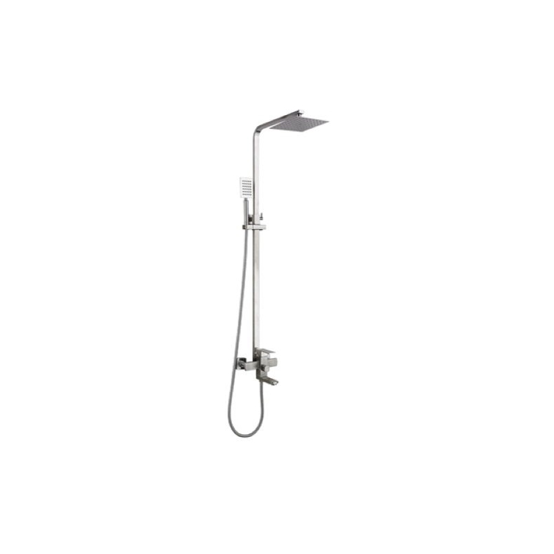 Душова стійка (тропічний душ) виконана в дизайнерському стилі "хай-тек", що додасть комфорт і затишок у вашій ванній кімнаті. Виготовлена з нержавіючої сталі марки AISI 304 що істотно впливає на тривалу роботу виробу. В комплект входить штанга, кріплення для лійки, лійка з шлангом, змішувач і верхня лійка. Висота штаги 125-135см.
